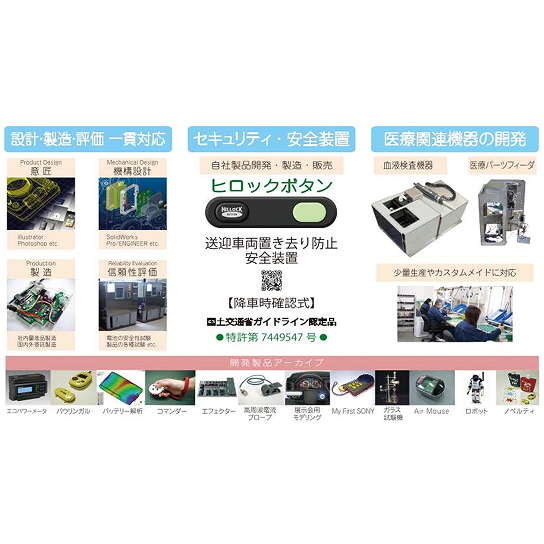 幅広い製品の開発製造を一貫して対応。自社開発製品として置き去り防止装置のヒロックボタンがある。